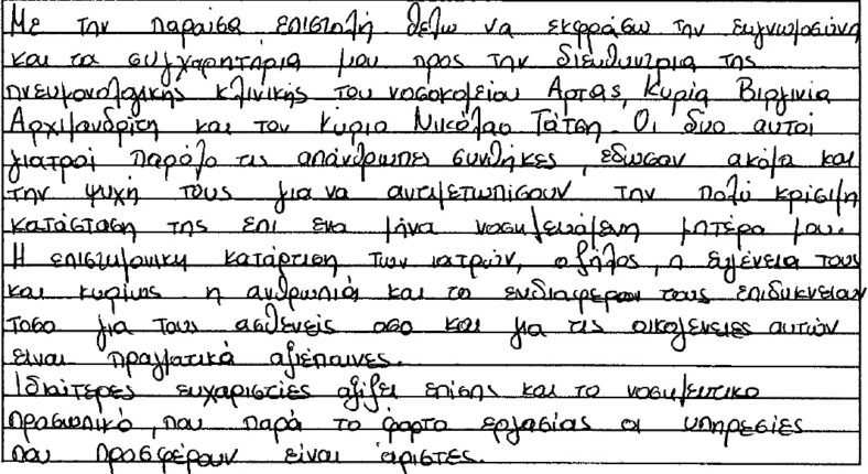 Είμαστε στην ευχάριστη θέση να δημοσιοποιήσουμε τις ευχαριστήριες επιστολές του κ. Σιώζου Κωνσταντίνου και της κ. Σιώζου Μαρίας προς την Πνευμονολογική Κλινική την κυρία Αρχιμανδρίτη Βιργινία, Διευθύντρια της Πνευμονολογικής Κλινικής και τον κύριο Νικόλαο Τάτση Επιμελητή Α της Πνευμονολογικής Κλινικής του Νοσοκομείου μας